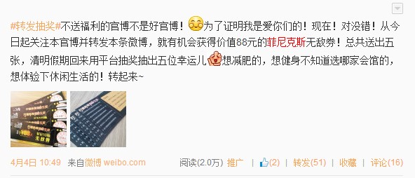 活動(dòng)概述:不送福利的官博不是好官博!從今日起關(guān)注E滁州官博并轉(zhuǎn)發(fā)活動(dòng)微博,就有機(jī)會(huì)獲得價(jià)值88元的菲尼克斯無(wú)敵券!通過(guò)E滁州官博活動(dòng),結(jié)合微博快媒體的特性,短時(shí)間內(nèi)引起網(wǎng)友關(guān)注,幾小時(shí)就轉(zhuǎn)發(fā)過(guò)50次。