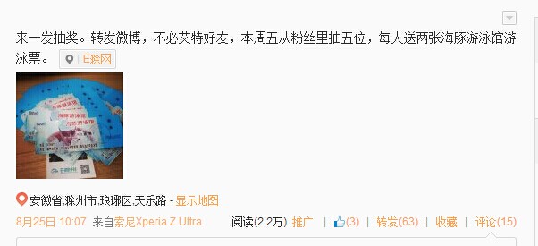 活動概述:利用微博傳播速度快參與方式簡便以及互動性強(qiáng)的特點開展了轉(zhuǎn)發(fā)送游泳票的活動。參與方式非常簡便,只需關(guān)注我們的官方微博,再轉(zhuǎn)發(fā)發(fā)布的信息便有機(jī)會獲得游泳票;抽獎方式利用新浪微博自帶的抽獎系統(tǒng),公平公正無爭議。