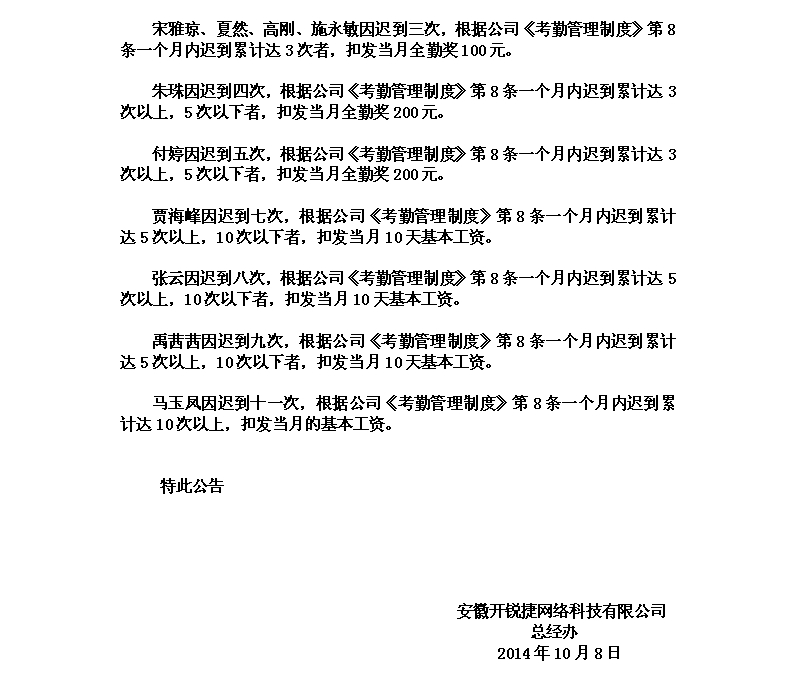 E滁州9月份遲到處罰公告(2014)字025號(hào)
