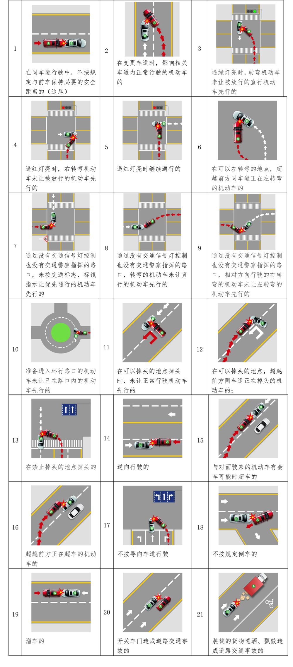如下圖所示,適用互聯(lián)網(wǎng)在線快處快賠的交通事故情形共包括21種。采用互聯(lián)網(wǎng)在線快處快賠模式時(shí),事故責(zé)任分為全部責(zé)任、同等責(zé)任和無責(zé)任三種。一方當(dāng)事人具有下列事故情形的,該方當(dāng)事人負(fù)事故全部責(zé)任;各方當(dāng)事人均有下列事故情形的,各方當(dāng)事人負(fù)事故同等責(zé)任。各省級(jí)公安機(jī)關(guān)交通管理部門可以根據(jù)實(shí)際,增加確定負(fù)事故全部責(zé)任、同等責(zé)任的具體情形。